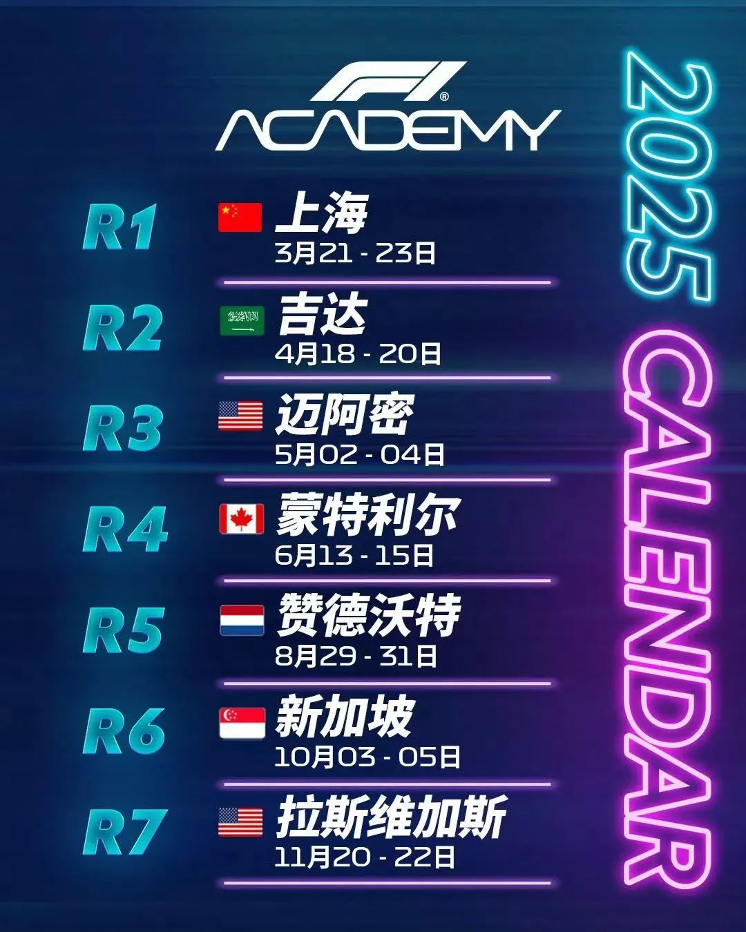 F1学院在哪些地方进行比赛?2025赛季的赛历包含七站赛事,分布在六个国家,每一站赛事都会在F1大奖赛周末进行,揭幕战中国站将与2025 FORMULA 1 喜力中国大奖赛在上海国际赛车场同期举行。