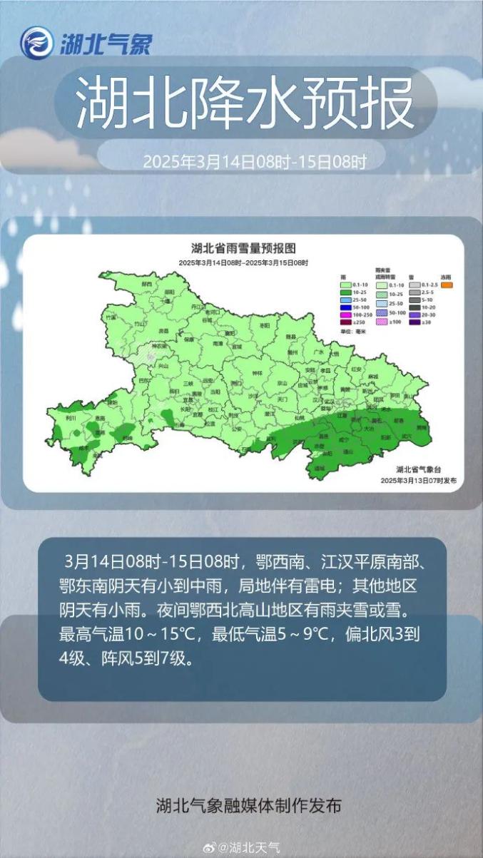3月13日08时-14日08时,鄂西南、江汉平原南部、鄂东南阴天有小雨,局地伴有雷电和雨雾;其他地区阴天有短时小雨。最高气温14~18℃,最低气温8~12°,偏北风3级、阵风4到5级。3月14日08时-15日08时,鄂西南、江汉平原南部鄂东南阴天有小到中雨,局地伴有雷电;其他地区阴天有小雨。夜间鄂西北高山地区有雨夹雪或雪最高气温10~15℃,最低气温5~9℃,偏北风3到4级、阵风5到7级。