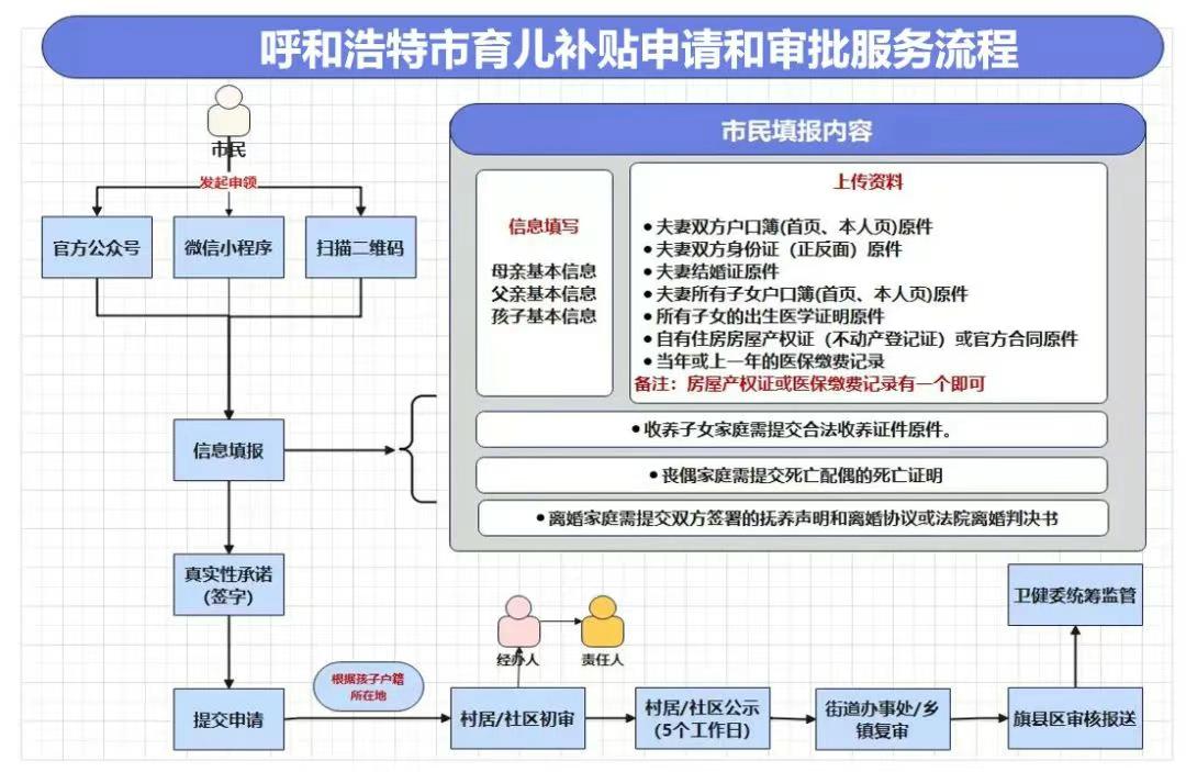 在申报审核上,孩子首次落户呼和浩特市后,先进行“免申即享”资格确认,通过信息化手段自动审核,审核通过后以短信告知群众补贴发放方式。家庭也可主动申请,产妇可通过助产机构、公安部门办理落户窗口、社区/村(居)委会、“爱青城”公众号、“健康呼和浩特”小程序等多种渠道扫描专用二维码提交申请,上传相关资料并承诺信息真实有效。旗县区、乡镇(街道办事处)、村(居)委会每年5月和11月自下而上进行审核。二孩、三孩及以上育儿补贴分年度发放的,申请人在下一年度集中审核期间需提交“年审”申请,无需再次进行信息填写和资料上传 。育儿补贴通过确定的资金发放渠道发放,免申即享和个人申请审核通过后于每年7月、1月发放两次。