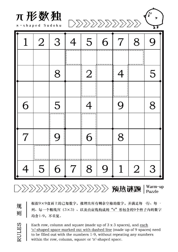 游戏规则:题面是一个9*9的方格表,划分为9个3*3的小部分,并标明了一个由9个格子组成的“π”形区域。格子中已经填写了一些数字,玩家需要用数字1-9填满剩余方格,使得每行、每列、每个3*3区域以及“π”形内都满足1-9恰出现一次。完成后根据所选题目的难度发放积分。