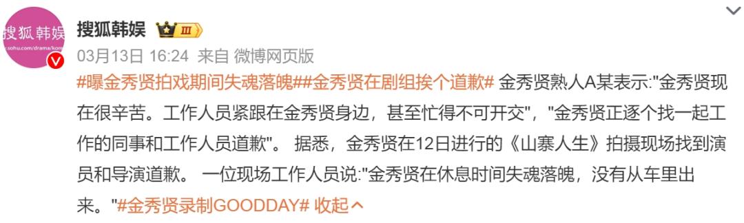 据悉,金秀贤在12日进行的《山寨人生》拍摄现场找到演员和导演道歉。一位现场工作人员说:“金秀贤在休息时间失魂落魄,没有从车里出来。”
