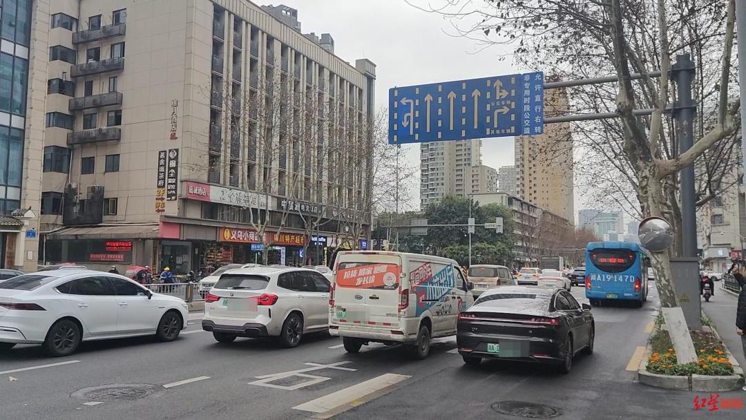 ▲路口增设的“非专用时段公交道允许直行右转”标示牌
