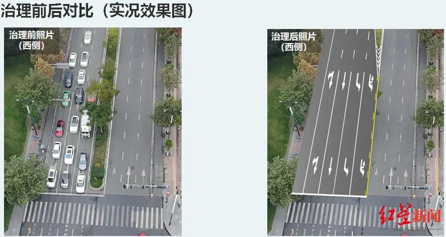 据悉,该路口辅道原先只有2根车道,且未设置左转专用道,左转与直行位于一根车道,常常出现左转直行互挡的情况。加上周边汇聚了成都西博西南食品城、水产交易市场、建材城以及物流仓库等,早晚高峰时段车辆密集,拥堵成为日常。