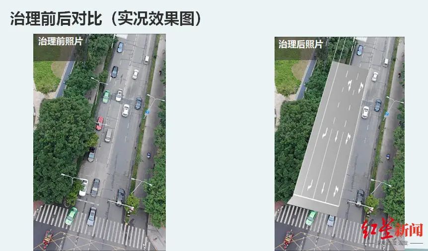 治理措施:拆除原有1.5米宽、50米长的侧分带改造为车行道,改造后增加一条机动车道,一条非机动车道。