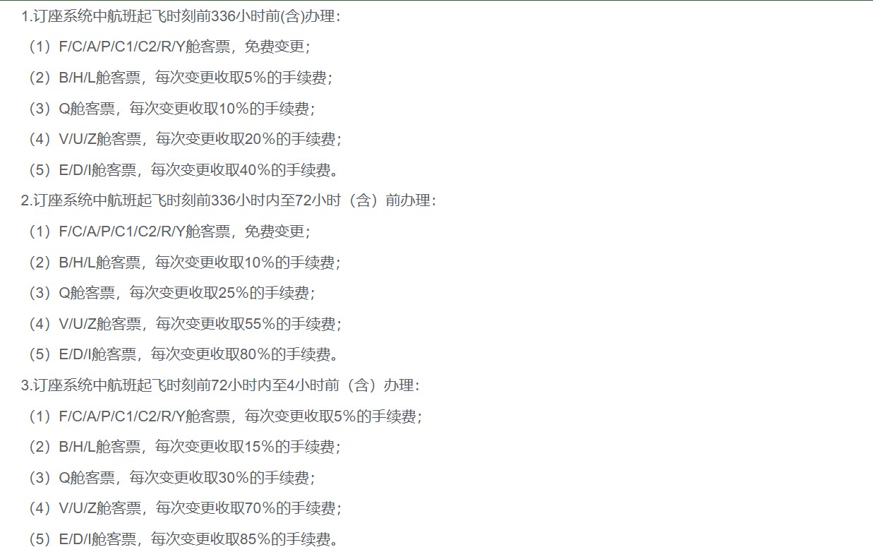 记者查阅浙江长龙航空公司官网公示的《客票退改签规定》发现,该公司根据舱位等级制定了差异化的退改签手续费标准。现行舱位体系共设头等舱、公务舱(含子舱位)、超级经济舱(含子舱位)及经济舱四大类,各舱位类别下均设细分舱位。以经济舱为例,其下细分为K、J、W、T、E、D、I等不同舱位,其中E、D、I舱被列为特价舱位。该特价舱位退改签规则显示:若旅客在航班起飞前336小时至72小时内(含)办理退改手续,需支付票面价格80%的手续费,这一收费标准为各舱位中收费比例最高等级。