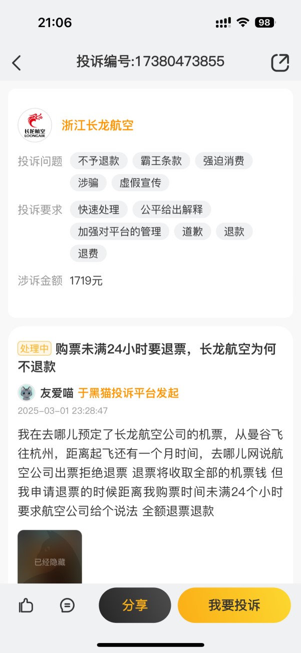 记者了解到,与刘女士有类似遭遇的消费者不在少数。记者以“浙江长龙航空”“手续费”为关键词在黑猫投诉平台搜索,发现相关投诉超过1700条。