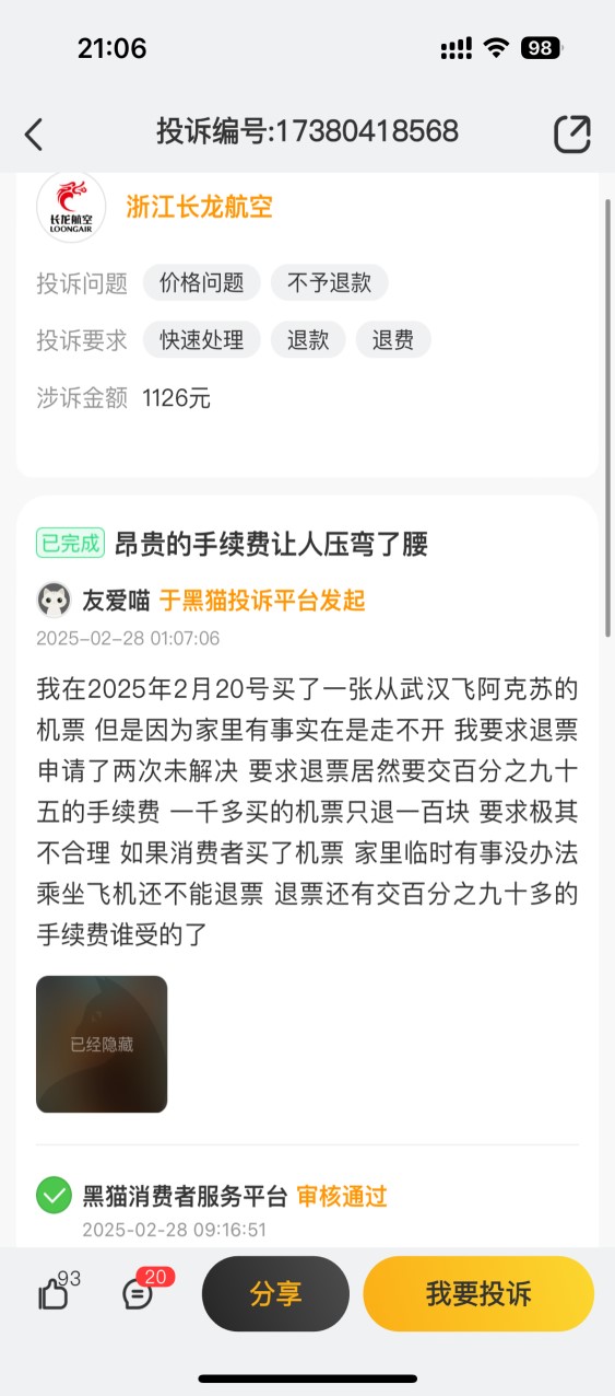 有消费者表示,自己于2月13日在浙江长龙航空订了两张贵阳至杭州的机票,因为看错时间需要退票,短短十分钟却要收取高额手续费。除收取高额手续费外,也有消费者投诉称自己在遭遇突发疾病等特殊情况时,退票诉求频频受阻。