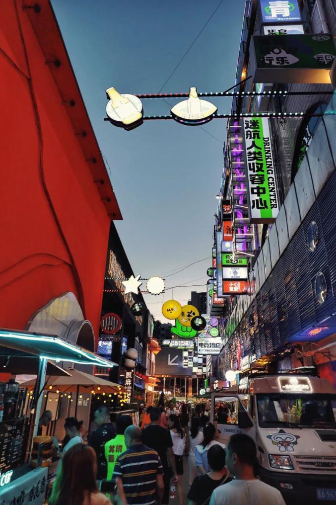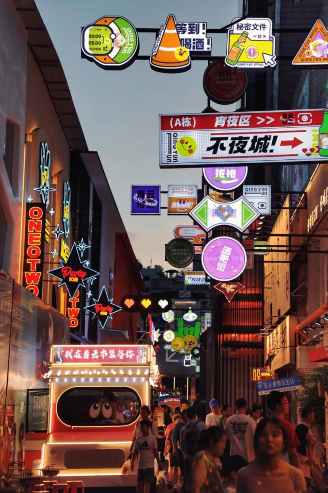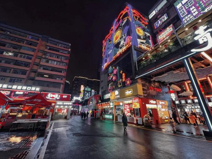 摄影:王晓夜幕降临,青云市集摇身一变成为赛博朋克风格的街区,霓虹闪烁,招牌错落有致,烟火气息与现代风情交织,带来强烈的视觉冲击,随手一拍就是赛博朋克大片。