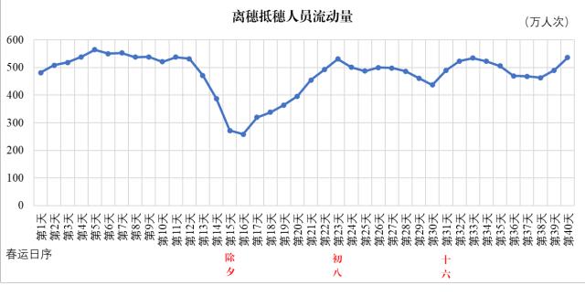 从春运40天离穗抵穗人员流动量来看,广州客流高峰峰值并不突出,但却有近半天数的人员流动量超过500万人次。