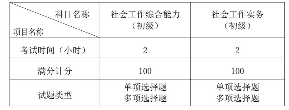 1.助理社会工作师:考试科目为2门,即《社会工作综合能力(初级)》《社会工作实务(初级)》。各科目考试试题类型及时间如下: