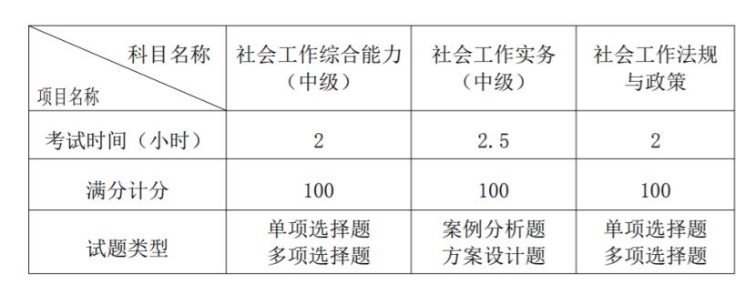 2.社会工作师:考试科目为3门,即《社会工作综合能力(中级)》《社会工作实务(中级)》《社会工作法规与政策》。各科目考试试题类型及时间如下: