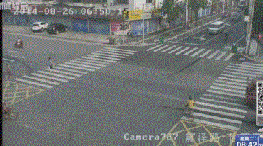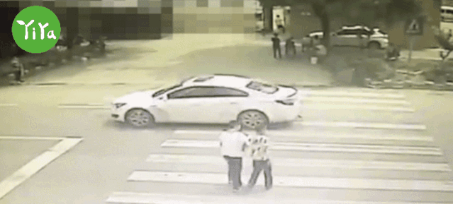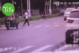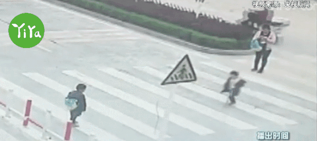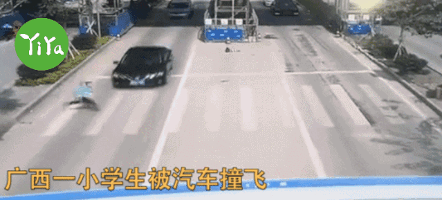 ☞ 注意看车辆过斑马线前,要注意看车辆。下面这位背着书包过斑马线的同学,没有左右观察车辆,而是径直的往前走,结果悲剧发生了。