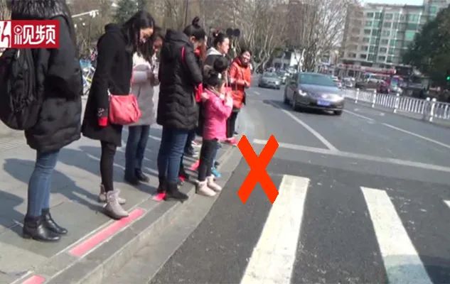 ☞ 要停在安全、开阔的位置过斑马线前停在哪里也是有学问的,停的位置不对,也会存在危险和隐患。下图中人们停的位置都是错误的。因为停在等候区路缘石下或斑马线上,很容易被转弯的车辆刮倒而发生碾压事故。
