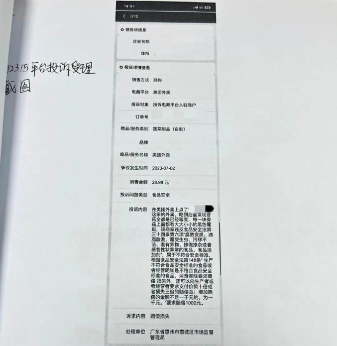 琳琳便立即在12315平台投诉该商家。7月7日,市场监督局电话联系琳琳组织调解,琳琳要求商家按照《中华人民共和国食品安全法》规定赔偿1000元。