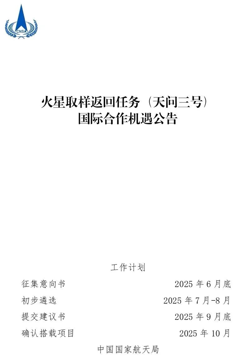 2025年3月11日,中国国家航天局(CNSA)官网发布《火星采样返回任务(天问三号)任务国际合作机遇公告》。