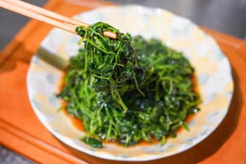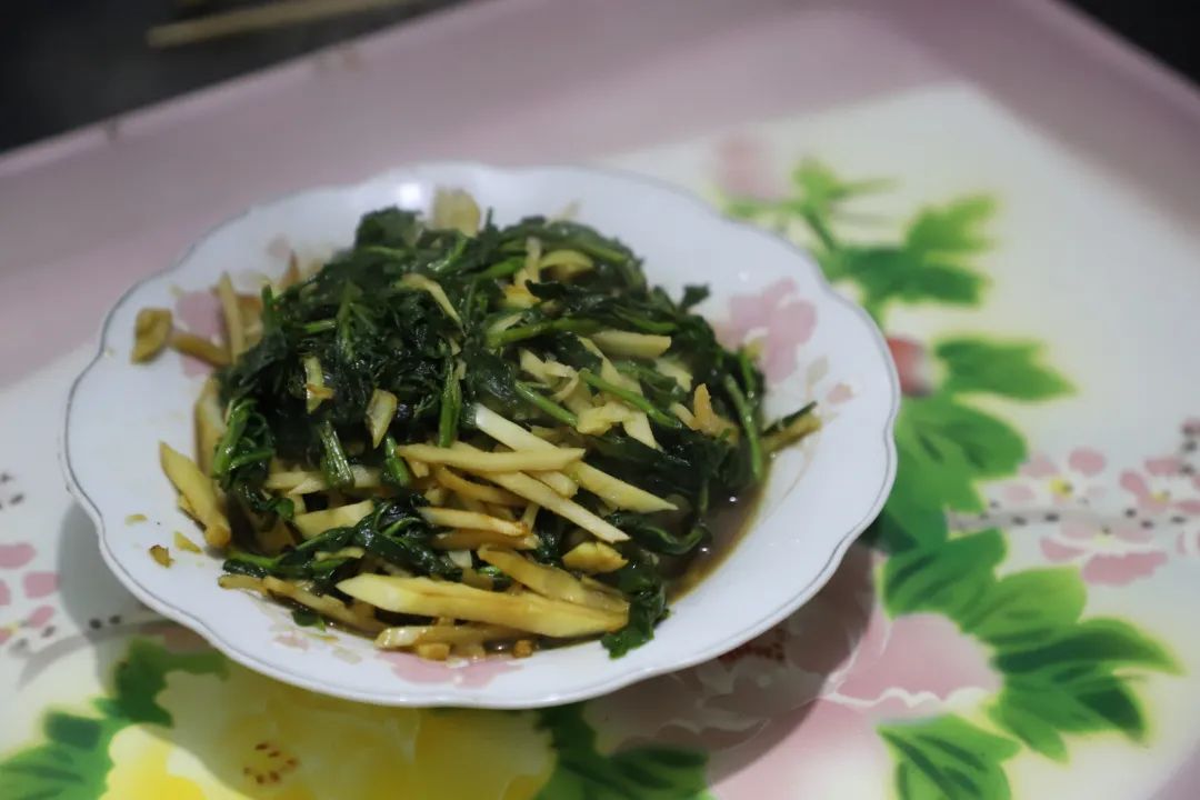 一道笋丝炒枸杞头,清新爽口,鲜味自然。这一道营养丰富、口感清脆的春季时令菜肴,只需要简单几步,薄油翻炒,加入一点盐,一点酱油调味,最后加点糖中和枸杞头的苦味。吃下这一口枸杞头炒笋丝,吃下这个春天。