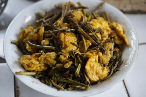 “颜色鲜亮、叶片饱满、没有病虫害的痕迹,这样的香椿新鲜、口感好。”大宏村的顾阿姨买了一小袋香椿,回到家后立刻忙碌起来。起锅烧油、倒入鸡蛋液和切成小段的香椿,快速翻炒几下后,一盘色泽金黄、香气四溢的香椿炒蛋就完成了。
