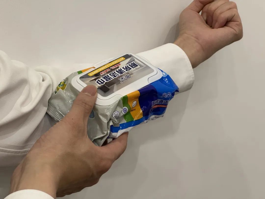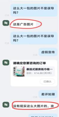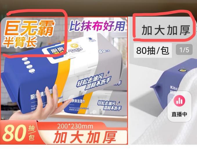 除了“视觉骗局”,部分商家还玩起“文字游戏”,利用夸大性词汇描述商品规格。商品宣传页面中标注“加大加厚”“巨无霸”“半臂长”厨房清洁湿巾,到手后实际大小不足三分之一臂长,湿巾展开后“薄如蝉翼”,长度宽度仅一手掌。还有部分商家夸大使用次数,却用免责声明“耍无赖”。