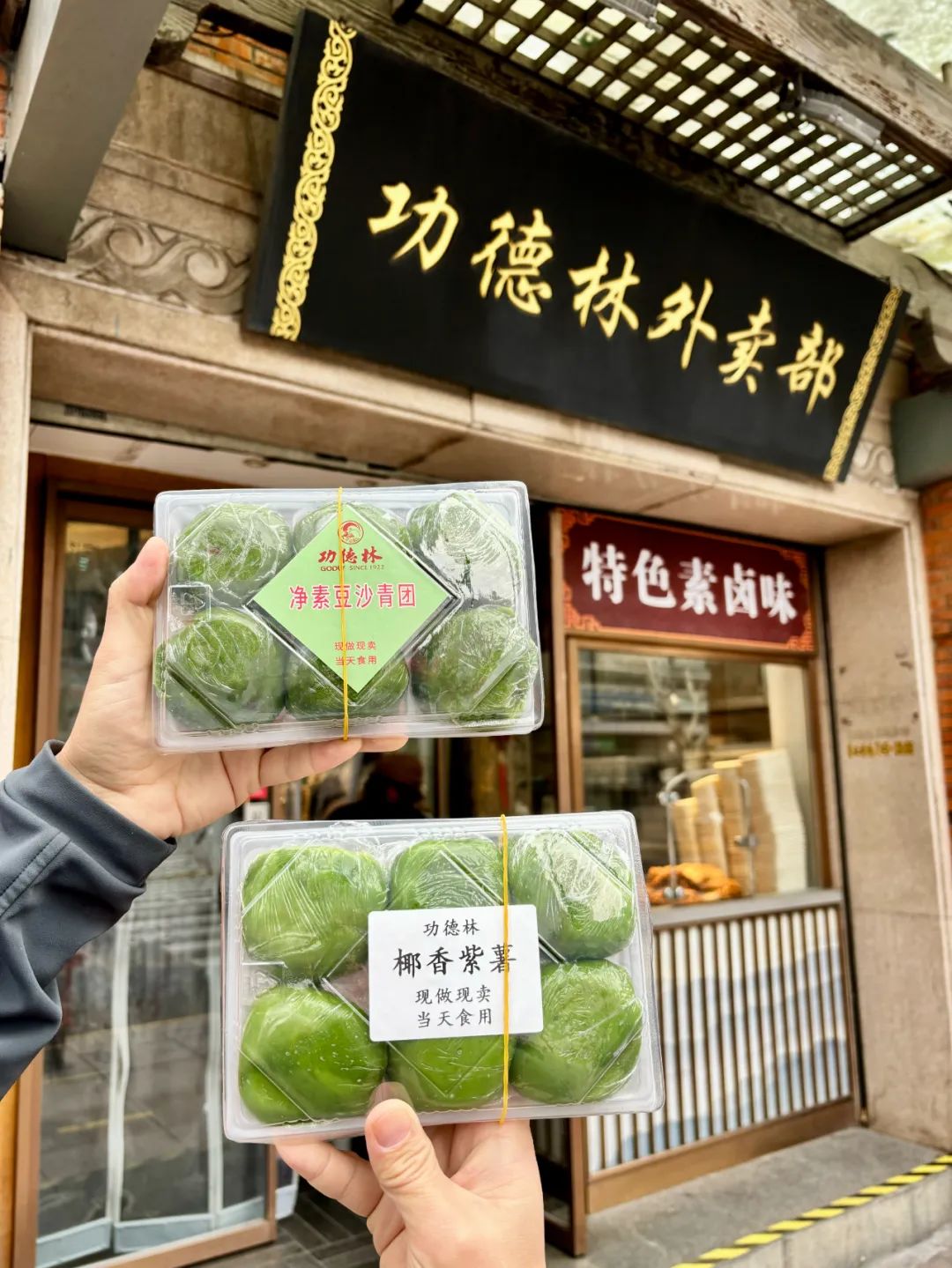 马兰头青团以新鲜野菜搭配香干碎,清爽中透出淡淡烟火气;荠菜馅料则与嫩豆腐交融,咸鲜之余更添柔润。素肉松青团延续了功德林“以素仿荤”的绝活,蓬松的素肉松裹挟豆香,咸甜交织的层次感令人回味。甜口爱好者偏爱的豆沙、黑芝麻青团也毫不逊色——赤豆沙绵密低糖,黑芝麻馅现磨醇香,搭配厚实软糯的绿色外衣,每一口都是传统手艺的温度。