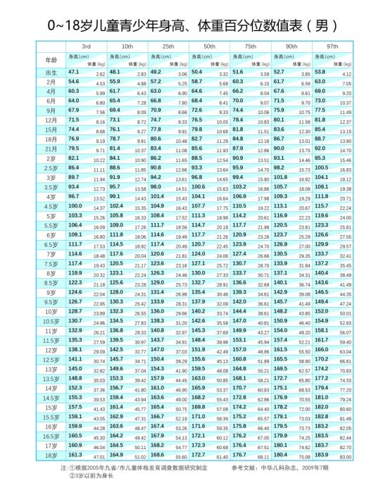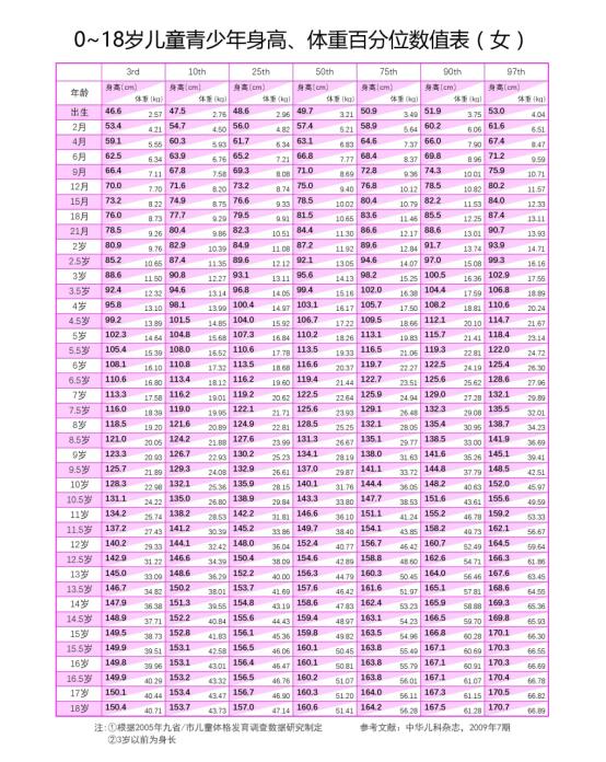 家长可参考下表对照(粉色女孩,蓝色男孩),看看孩子的身高发育是否“输”在了起跑线上。如果家长发现自己的孩子是班级里同性别孩子中个子最矮的,或每年生长速度少于5厘米时,应考虑孩子可能存在生长障碍。