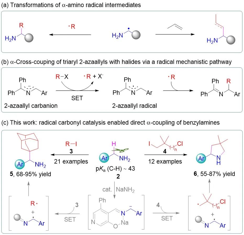 α-氨基自由基是一类具有高活性和合成价值的片段,可参与C-C键形成和π-键加成,具有广泛的合成应用潜力 (图1a)。然而α-氨基自由基的不稳定性和短暂的寿命限制了它在合成中的应用。为了解决这个问题,化学家们通过引入适当的醛或酮保护基,形成共轭作用稳定的2-氮杂烯丙基自由基,进而调控相关的反应。在该领域,Walsh及其同事以做出了开创性的研究,他们发现二苯甲酮-苄胺亚胺负离子能够与卤代烷发生单电子转移,生成相对稳定的2-氮杂烯丙基自由基,该自由基与烷基自由基复合生成α-取代的苄胺产物(图1b)。我们设想:以醛或酮为羰基催化剂,催化产生相对稳定的2-氮杂烯丙基自由基,进一步与自由基物种或π-体系反应,实现伯胺的α-C-H直接官能化。尽管羰基催化能够有效促进伯胺α位与亲电试剂的直接反应,但自由基历程的羰基催化过程尚未建立。