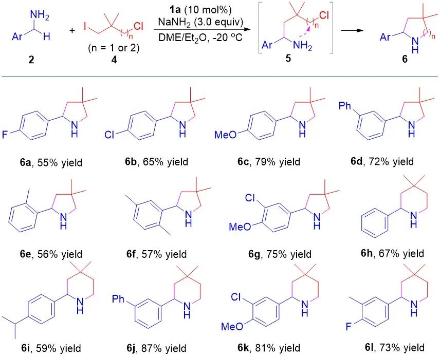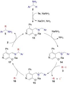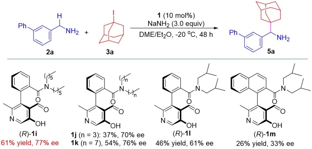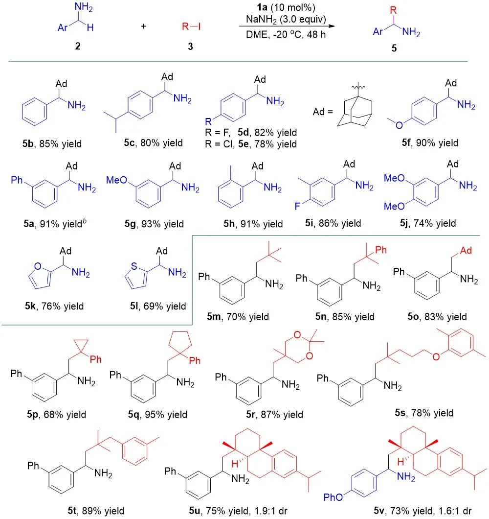 综上所述,使用吡哆醛作为催化剂,本文成功地实现了NH2未保护的苄胺2与大体积烷基碘3和4的直接α-交叉偶联反应。该反应为在苄胺的α位引入大位阻取代基提供了一种高效新策略。该反应经历了自由基羰基催化策略,为伯胺的直接α-C-H转化开辟了一条新途径。