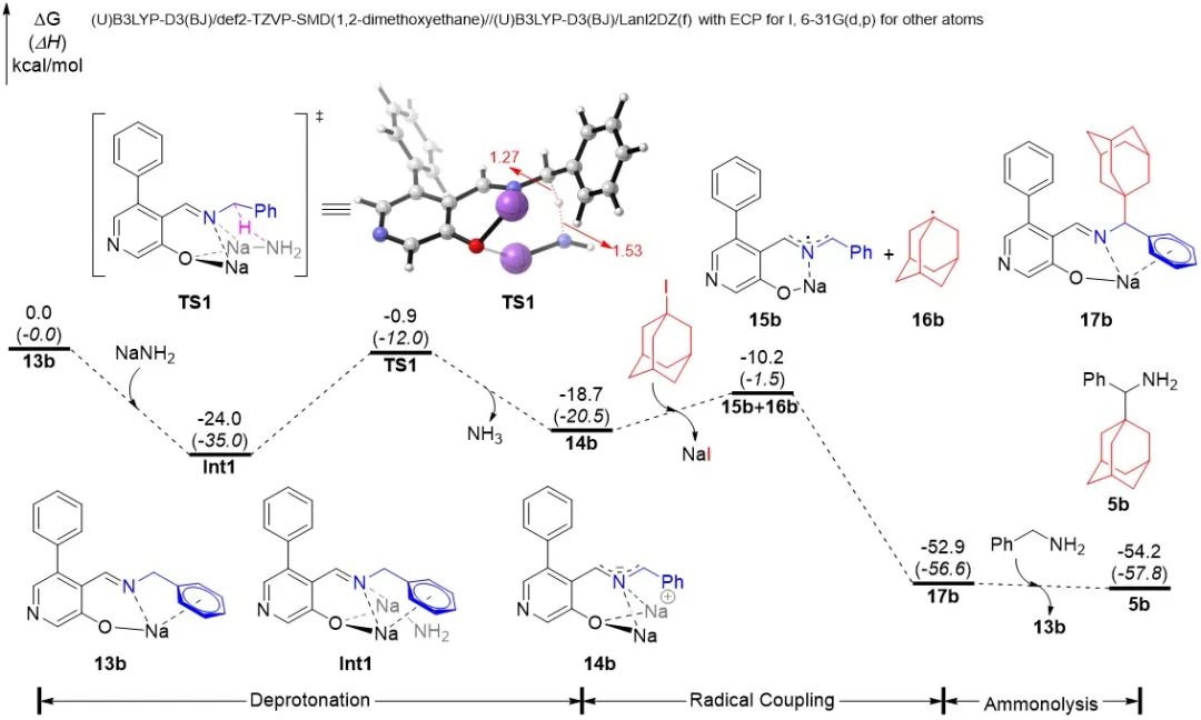 为了研究反应机理,作者进行了自由基钟实验,实验结果表明该反应经历了自由基过程 (图4)。据此,作者提出了可能的反应机理 (图5):在NaNH2存在下,苄胺2与吡哆醛催化剂1a缩合形成亚胺钠盐13。随后被NaNH2拔去质子形成离域的α-氨基碳负离子14,它与烷基碘3发生单电子转移 (SET),生成2-氮杂烯丙基自由基15和烷基自由基16。自由基交叉偶联得到中间体17。17与苄胺2反应释放出产物5并再生亚胺钠盐13,完成催化循环。亚胺13的形成活化了苄基C-H键,并显著提高了其C-H酸度,高达1012倍,促进了13去质子化为碳负离子14。作者所提出的机理也得到了计算研究的支持 (图6)。