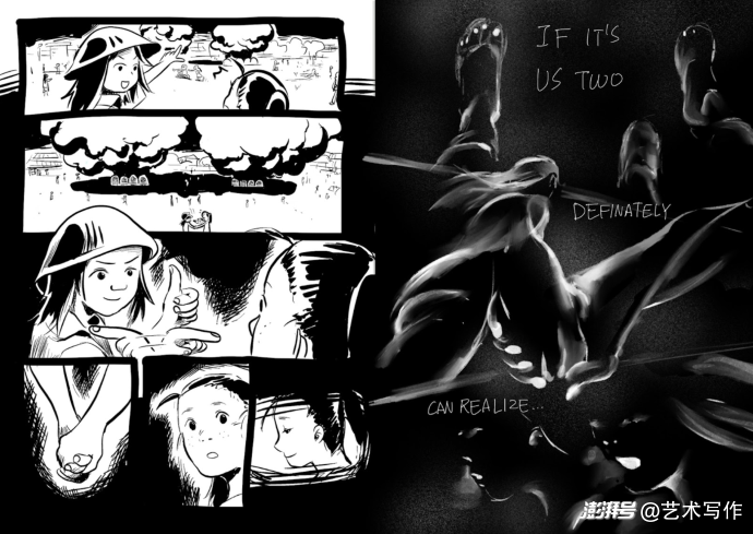 手语漫画内页,两个女孩用手语交流,戴帽子的女孩比你和我,可以,然后两人一起携手闭上眼睛行走