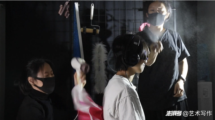 观众在中间,两个演员在后面表演进行触觉表演,一个人拿着喷雾,一个人拿着电吹风和布袋子