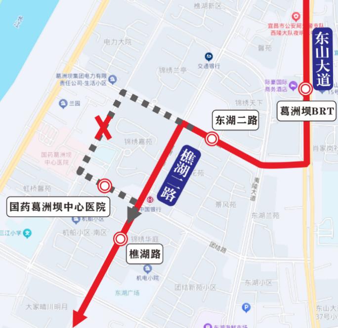 下行:线路由原线运行至东湖二路与樵湖二路交叉口后左转,经樵湖二路直行后恢复原线运行。临时取消国药葛洲坝中心医院1个站点。