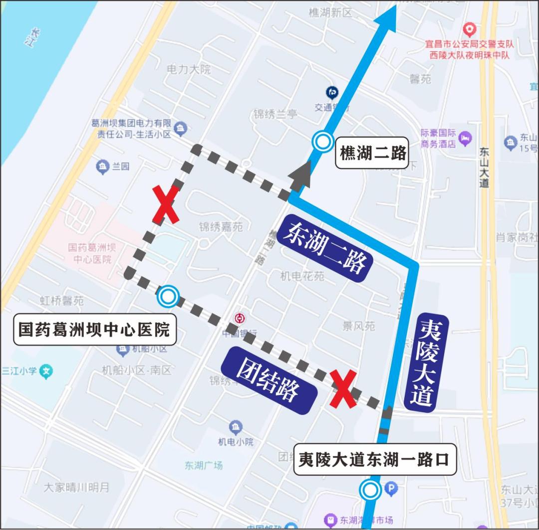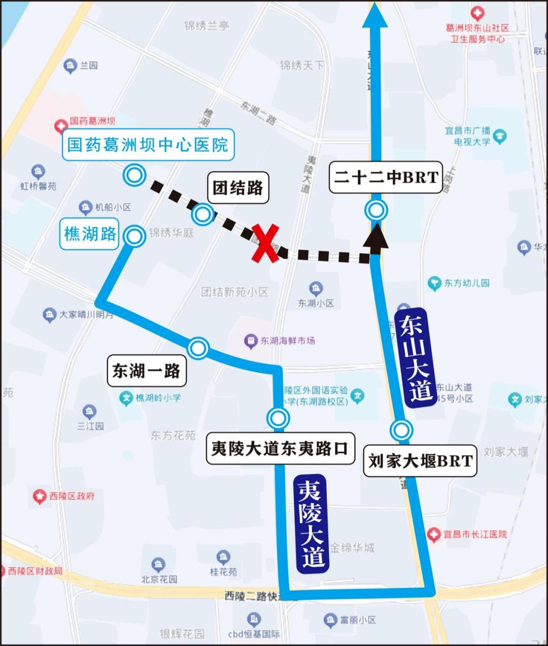 上行:线路由原线运行至夷陵大道与团结路交叉口后直行,经夷陵大道、东湖二路、樵湖二路恢复原线运行。临时取消国药葛洲坝中心医院1个站点。