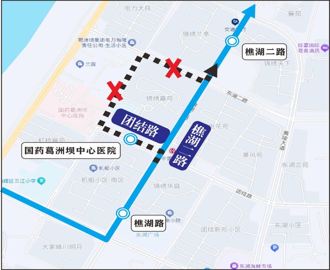 上行:线路按原线运行至樵湖二路与团结路交叉口后直行,经樵湖二路直行后恢复原线运行。临时取消国药葛洲坝中心医院1个站点。