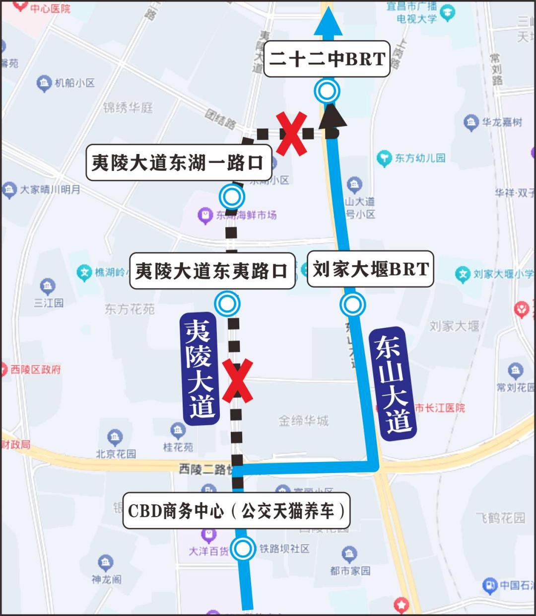 上行:线路由原线运行至夷陵大道与西陵二路交叉口后右转,经西陵二路、东山大道恢复原线运行。临时增加刘家大堰BRT1个站点。临时取消夷陵大道东夷路口、夷陵大道东湖一路口2个站点。