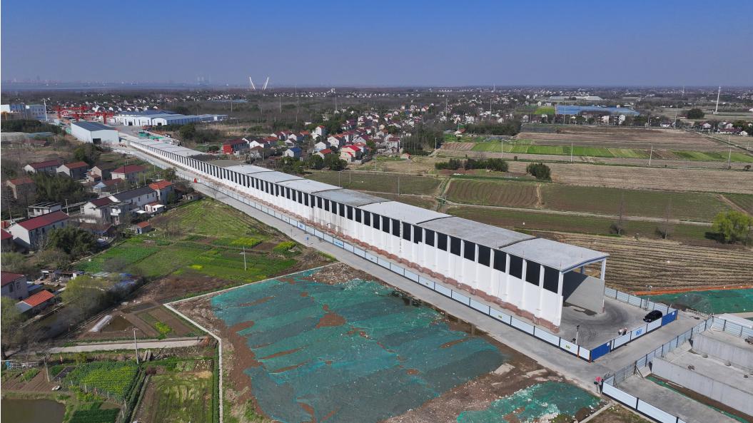 此前,隧道明挖段、路基段的主体施工已经顺利完成,崇明岛上高铁进隧道的出入口形态逐渐显现。崇太长江隧道向北与崇明特大桥相连,形成一个重要的衔接过渡区段。目前,该区段的主体结构施工已经完成,未来高铁将从这里出入崇太长江隧道。作为隧道与岛上高架衔接的路段,这里不仅承担着为高铁遮风避雨的功能,还兼顾景观需求。在施工期间,装载施工材料的大型运输车辆也以此作为通道,为工程建设提供了便利。