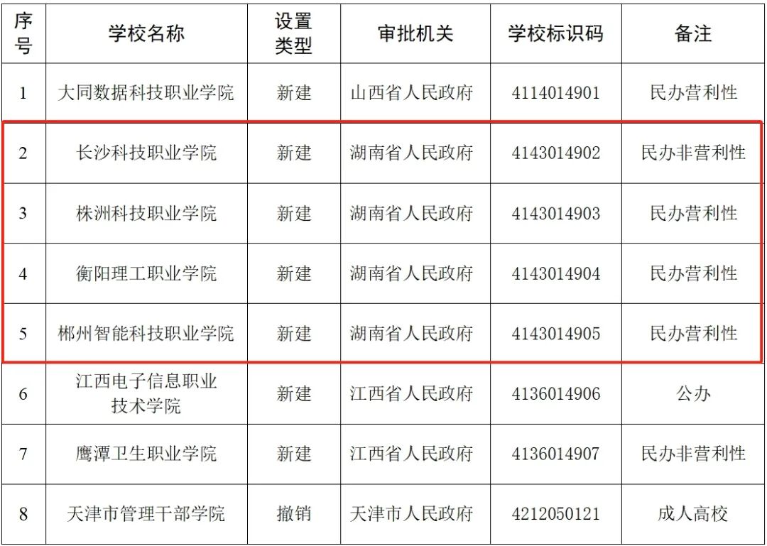 名单显示,湖南省新增4所专科高校,分别为长沙科技职业学院、株洲科技职业学院、衡阳理工职业学院、郴州智能科技职业学院,其中长沙科技职业学院为民办非营利性,其余均为民办营利性。