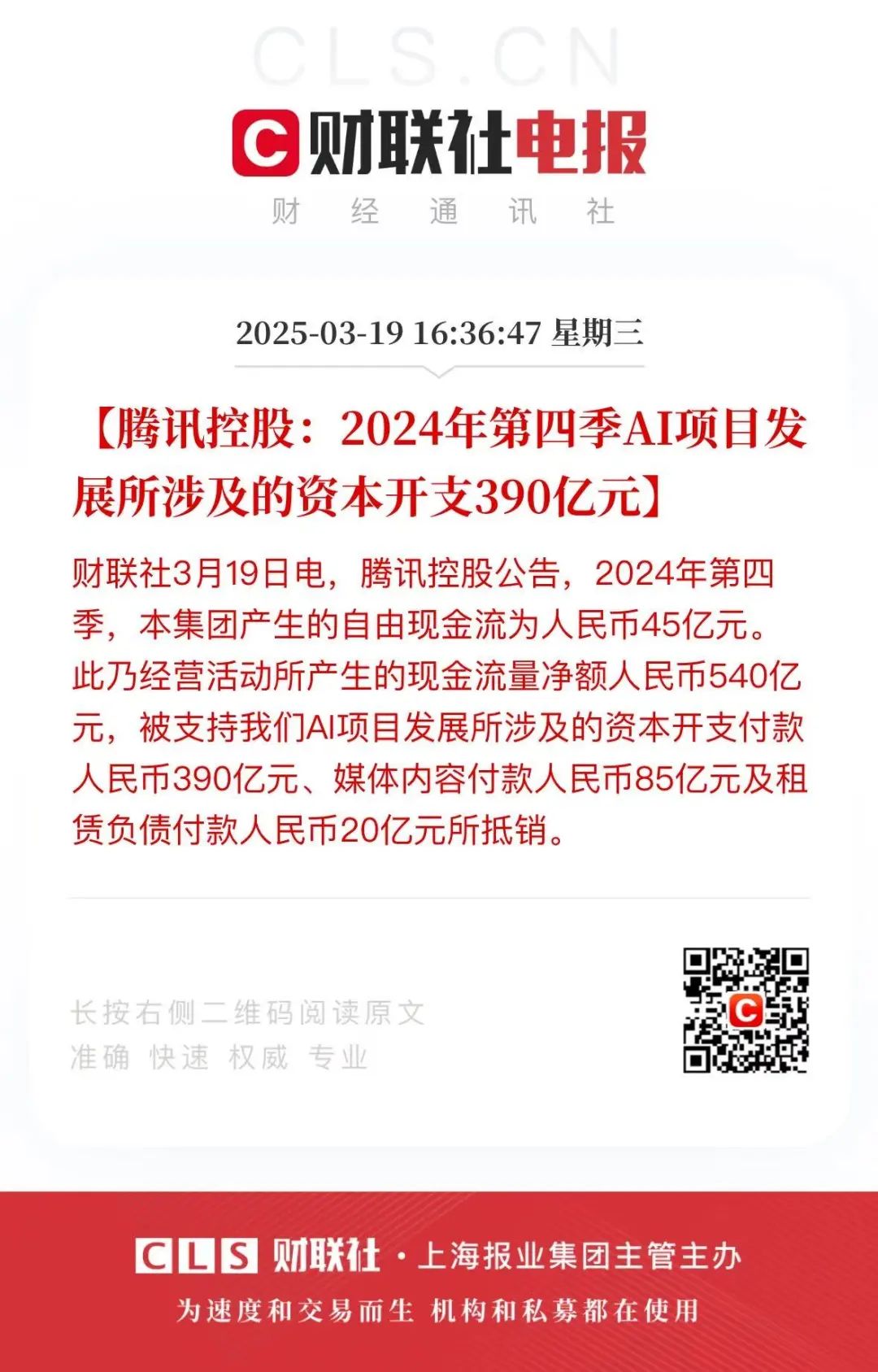 财联社向上滑动看下一个原标题:《腾讯控股:去年第四季AI项目资本开支390亿元》