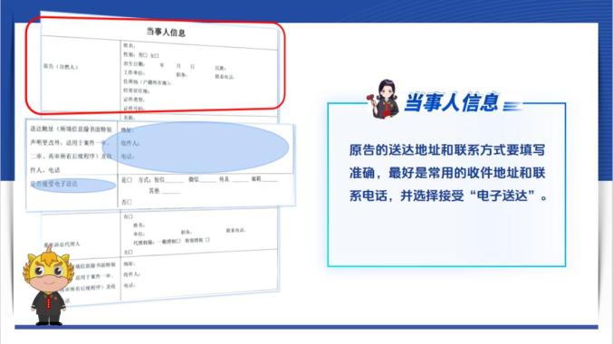 首先,填写当事人信息时,您只需要按照表格所列内容,准确、完整的进行勾选和填写就可以了。原告的送达地址和联系方式要填写准确,最好是常用的收件地址和联系电话,并选择接受“电子送达”,以便及时接收法院的相关文书。