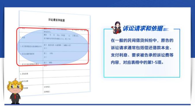 其次,诉讼请求和依据部分对应原告提出的权利主张。在一般的民间借贷纠纷中,原告的诉讼请求通常包括偿还借款本金、支付利息、要求被告承担诉讼费等内容,对应表格中的第1-5项。填写时,要写清楚具体金额和计算方式。