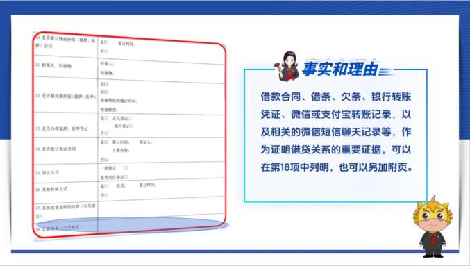 第四,事实和理由部分,示范文本根据民间借贷纠纷的特点细化了18项具体内容,您提供信息越全面,证据越充分,越便于案件事实的认定。填写时,需详细阐述合同(借据)签订的情况,包括约定的借款金额和利息,实际支付的金额,后续的还款情况,以及是否有担保、抵押和保证等情形,这些内容是法官查明案件事实的关键。同时,借款合同、借条、欠条、银行转账凭证、微信或支付宝转账记录,以及相关的微信短信聊天记录等,作为证明借贷关系的重要证据,可以在第18项中列明,也可以另加附页。