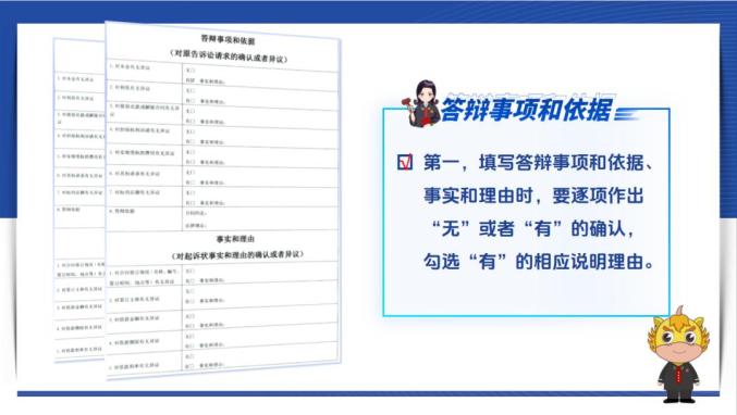 第一,填写答辩事项和依据、事实和理由时,要逐项作出“无”或者“有”的确认,勾选“有”的相应说明理由。