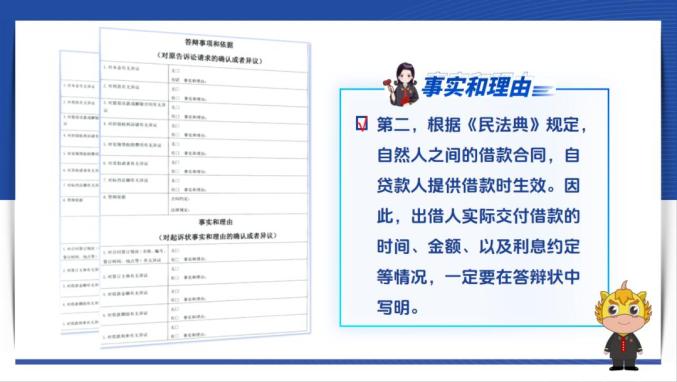 第二,根据《民法典》规定,自然人之间的借款合同,自贷款人提供借款时生效。因此,出借人实际交付借款的时间、金额、以及利息约定等情况,一定要在答辩状中写明。