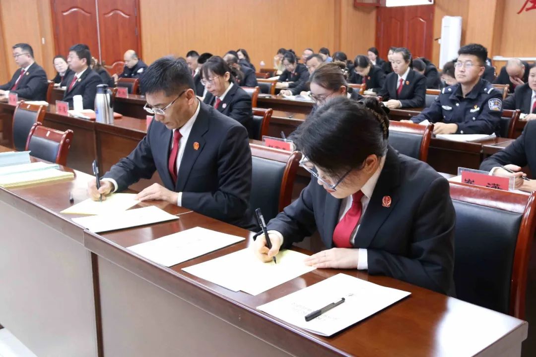 随后,党组书记、院长韩勇与班子成员代表、班子成员代表与部门负责人代表、部门负责人代表与普通干警代表签订了《2025年度党风廉政建设责任书》。