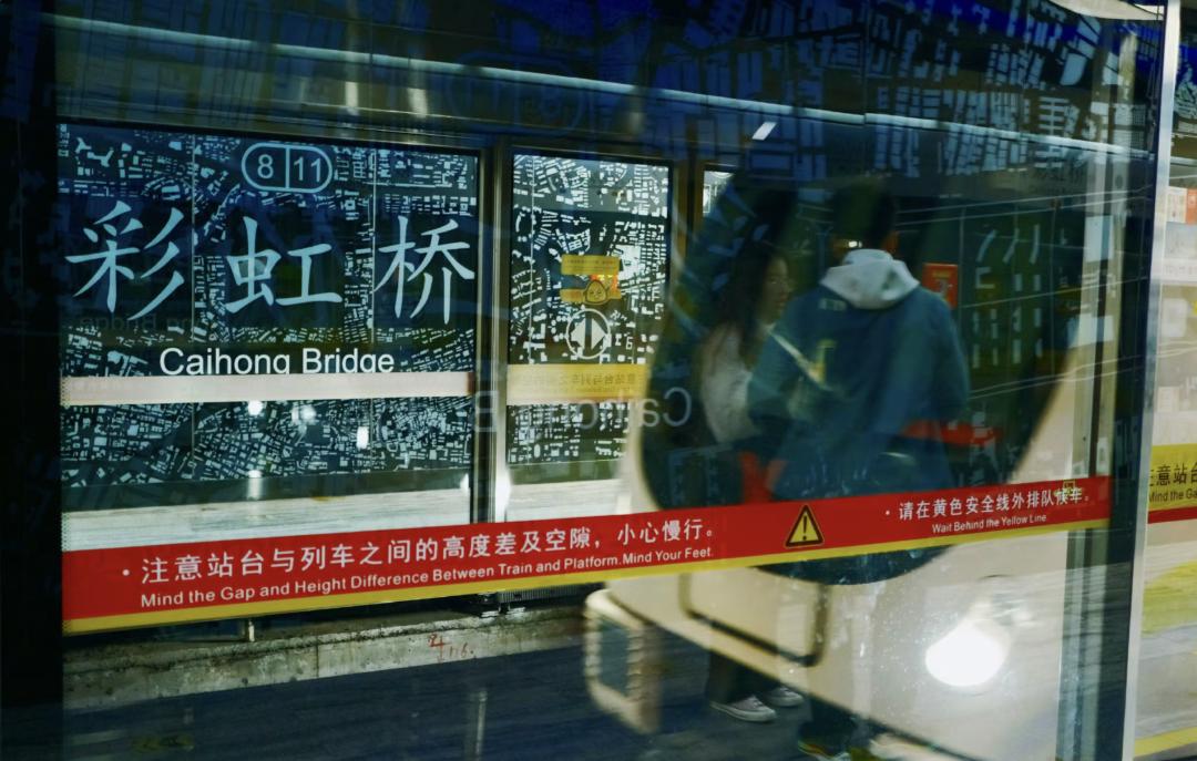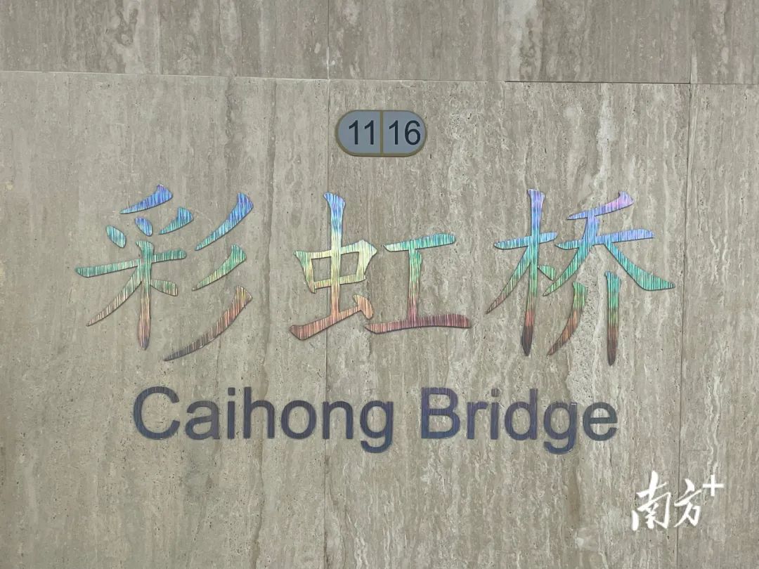 在站台上,“彩虹桥”三个字区别于其他站的黑色,彩色贴纸在光线折射下成为一道渐变彩虹。