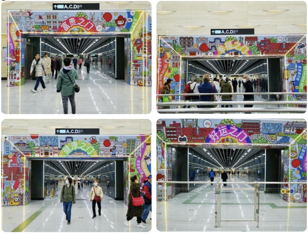 从地铁11号线前往8号线换乘的4条通道对应“富贵”“幸福”“健康”“好运”4个门,承载着人们对生活最美好的祝福。
