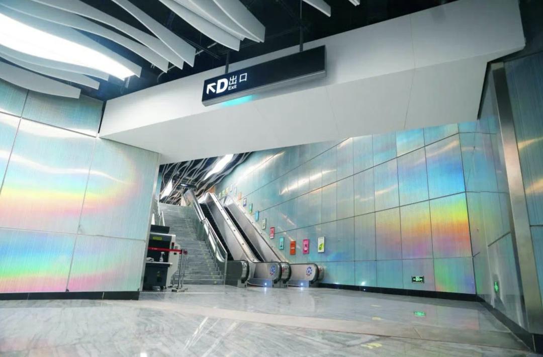 进入车站,站内墙壁采用具有反光材质的建筑材料,在室内光下会呈现大片彩虹流动。