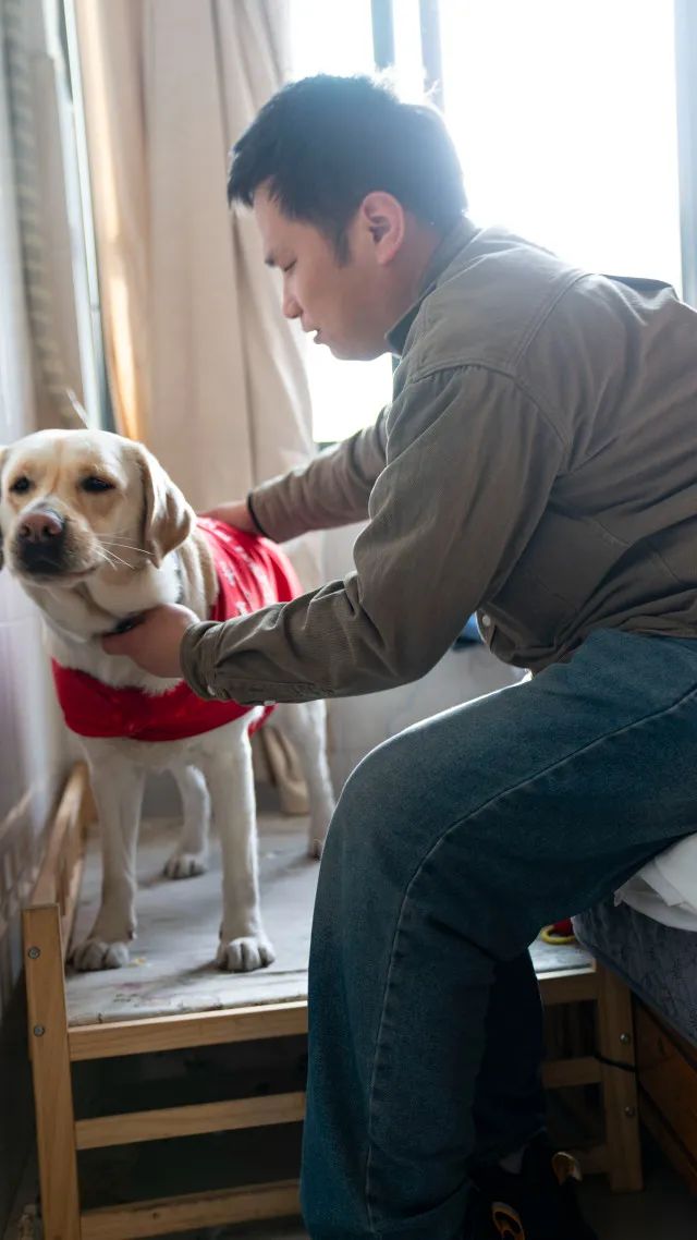 听到汪涛的指令,原本趴着的叮当闻声而起,蹲坐在地上,它知道自己即将进入工作状态。汪涛熟练地来到叮当身旁,蹲下,给它穿上导盲鞍与工作服,一切就位。