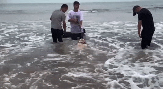 印象最深的一次,汪涛和叮当来到了海边,向往大海的他试着靠近海水,此时,一个海浪扑了过来,毫无防备的汪涛瞬间失去了重心,摔倒在沙滩上,叮当立刻咬住牵引绳,使劲地将他拖回安全区……