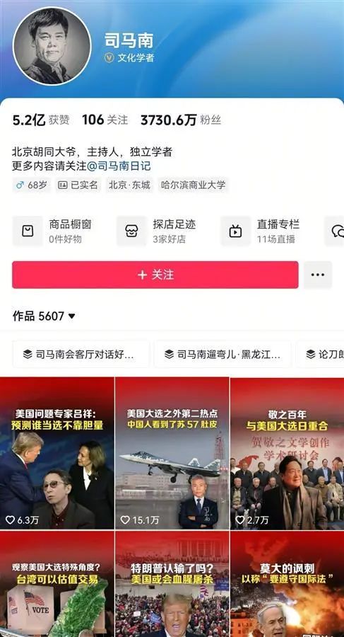 公开资料显示,司马南是一名网络大V,自我标签为主持人、独立学者、社会评论家、高级经济师、知名自媒体人……截至3月21日上午,其抖音账号粉丝3736.7万;今日头条号粉丝1642万,快手账号粉丝517.4万元、抖音司马南频道420.2万,微博账号粉丝321万,小红书账号粉丝1.8万,全网粉丝高达6600多万,这还不包括看不到粉丝数量的视频号。