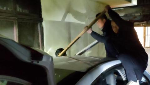 男子慢慢钻进车里
