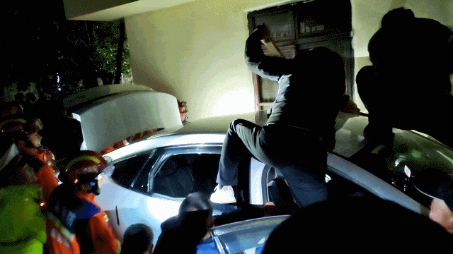 消防员到场时只见一辆白色轿车斜停在墙边